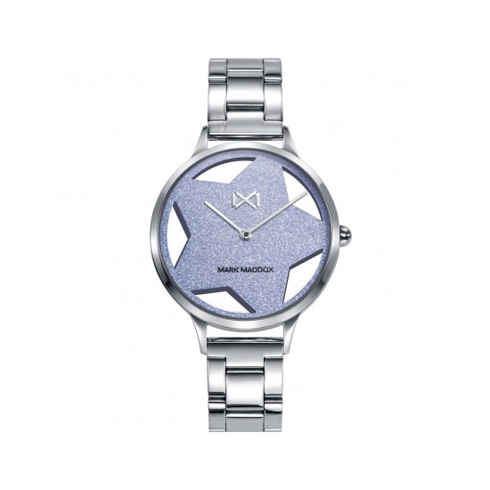 Reloj de Mujer Mark Maddox de la colección Tooting, dos agujas , caja y brazalete en acero. Esfera en forma de estrella en color gris brillante.