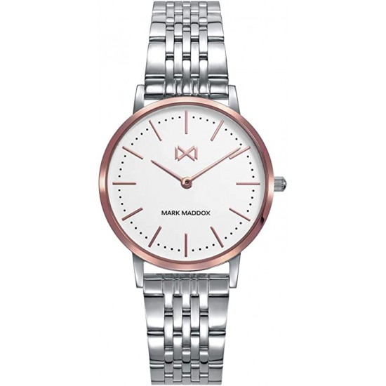 Reloj de mujer Mark Maddox de la colección Greenwich, dos agujas, caja y brazalete acero con bisel de caja en rosa, esfera bicolor de color plata e índices en rosa combinado con el mismo color del bisel y las agujas.