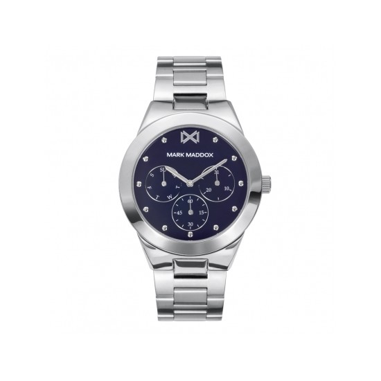 Reloj de Mujer Mark Maddox de la colección Alfama multifunción con la caja y el brazalete de acero, la esfera en azul y tres contadores localizados a las 3, 6 y 9.