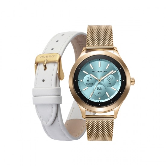 Smartwatch Viceroy SmartPro con caja y brazalete de acero en IP Dorado , pantalla táctil, con cuatro esferas propias para elegir. Los SmartPro son compatibles con teléfonos con un sistema operativo Android 5 o superior o iOS 10 o superior. Las funciones admitidas pueden variar entre plataformas y países. Con tu SmartPro podrás recibir tus llamadas , notificaciones y mensajes, medir tus pulsaciones y oxígeno en sangre, cuentapasos, distancia realizada, gestión de deportes, cronógrafo, controlar tu calidad de sueño, controlar tu música, control menstrual , definir alarmas, disparar la cámara de tu móvil de forma remota, localizar tu teléfono.