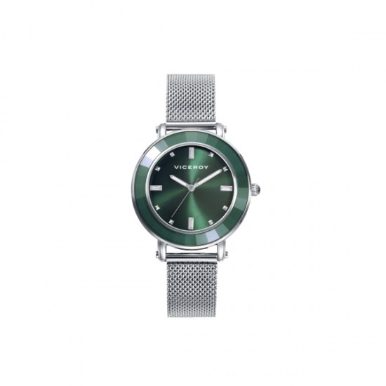 Hermoso reloj con esfera verde con circonitas baguette a las 3, 6, 9 y 12, malla milanesa de acero y bisel de cristal verde. Un complemento que trasciende, que va más allá, atrevido en su belleza. Una auténtica obra de arte para tu muñeca. Siente el privilegio de brillar con él.