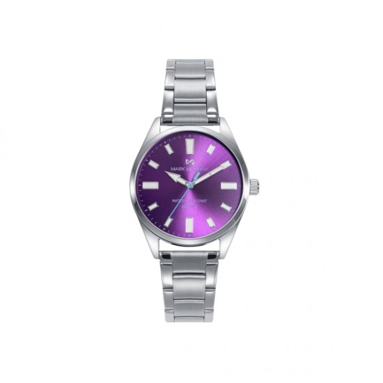 Reloj informal de Mujer Mark Maddox Marais, tres agujas, caja y brazalete de acero, esfera morada con índices y agujas de horas y minutos en color plata con luminous, aguja de segundos de color azul.