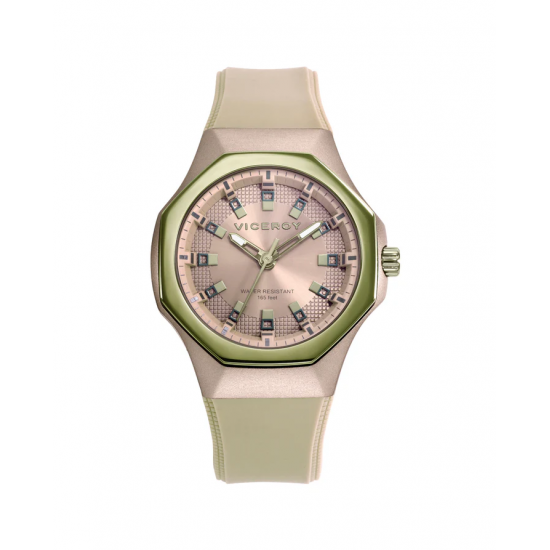 Un sofisticado reloj de mujer de tres agujas combina estilo y funcionalidad. La caja de aluminio en tono beige se complementa con un bisel de acero en color verde, creando un contraste elegante y moderno, mientras la correa de silicona beige proporciona comodidad y resistencia. Un accesorio perfecto para cualquier ocasión y único de Viceroy.