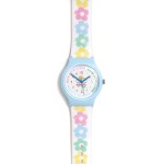 Reloj de flores en escala, con estuche polipiel, correa sándwich-band de PVC multicolor y hebilla de acero.
