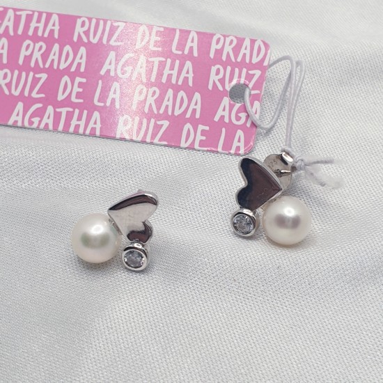 Pendientes Agatha Ruiz Plata de la colección Leonor , en plata de ley. Perla cultivada, circonita y corazón de plata. Cierre de presión.