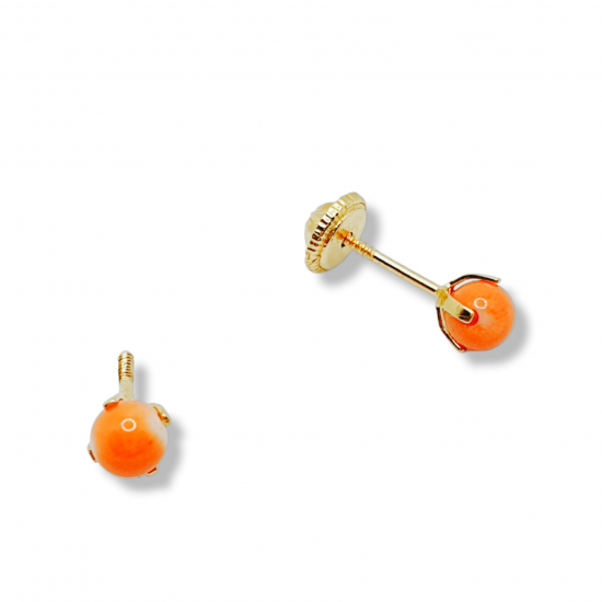 pendiente en oro de 18k. Bolita de coral de 4mm. Cierre de rosca.