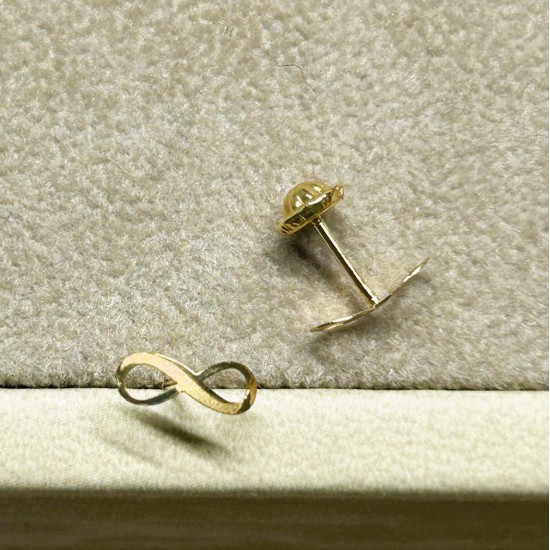 Pendientes en oro de 18k con diseño de infinito. Llevan cierre de rosca. Se entregan con spinny revolution para facilitar su colocación.