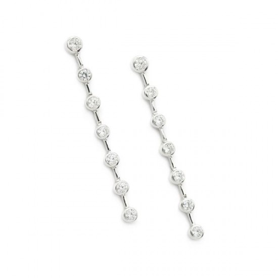 Pendientes largos de plata con movimiento y diseño lineal complementado con circonitas redondas en el centro.