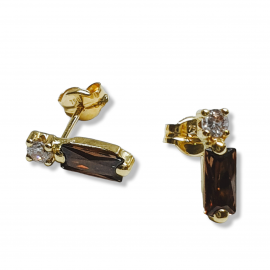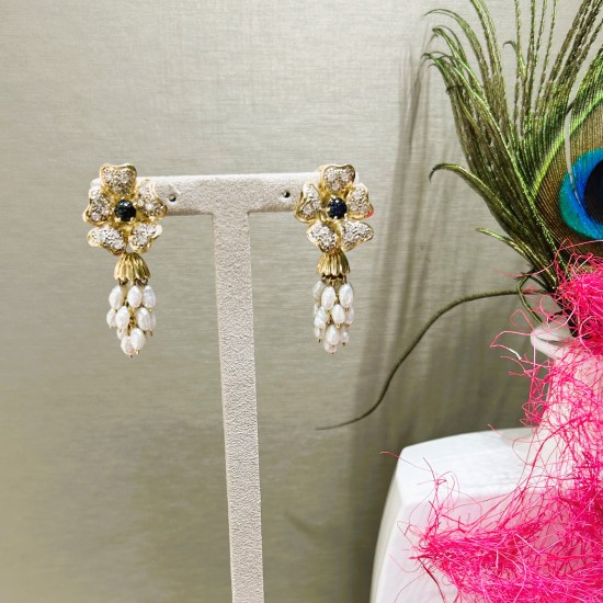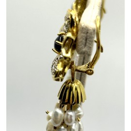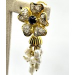 Pendientes largos en oro de ley. con circonitas y zafiro central. Cascada de perlitas naturales. Cierre omega. 45mm de largo