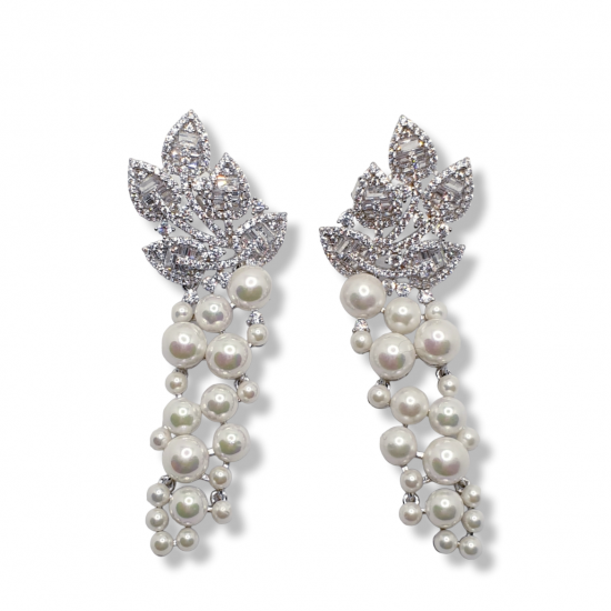 Pendientes largos en plata de ley, circonitas y perlitas de varios tamaños formando un racimo. Cierre de presión. 55mm de largo