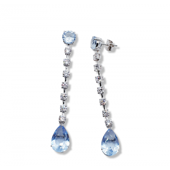 Pendientes en plata de ley con circonitas y piedras naturales color aguamarina. Cierre de presión. 70mm de largo