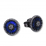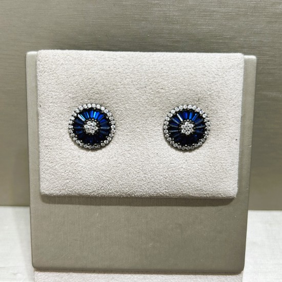 Pendientes en plata con baño de rutenio. circonitas blancas y otras en baguette color azul. Cierre de presión.