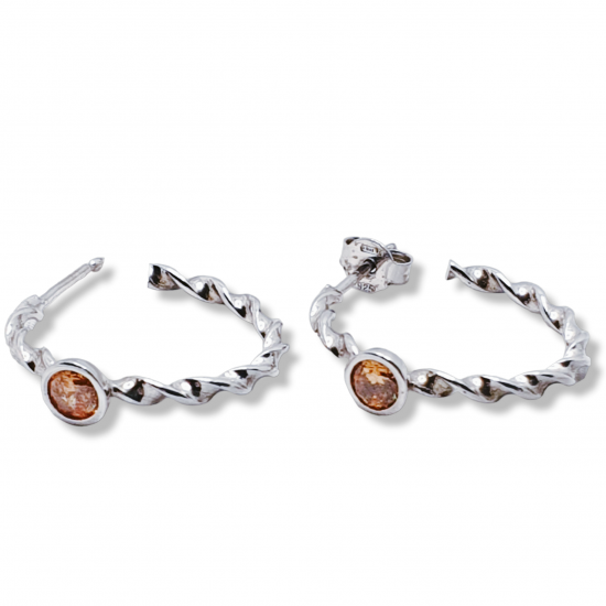 Aros en plata de ley torzados con detalle de circonita naranja. Cierre de presión. 18mm de diámetro