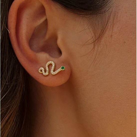 Pendientes trepadores de plata bañada en oro formados por la figura de una serpiente recubierta por circonitas blancas engastadas y una circonita de mayor tamaño en tono verde que simboliza la cabeza. Ideal para combinar junto al anillo.