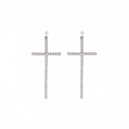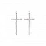 Pendientes largos en plata de ley y circonitas incrustadas. Diseño de cruz. Llevan cierre de presión. Miden 4.5cm de largo.