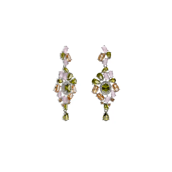 Pendientes con diseño largo y elegante. Las piedras dan vida a motivos florales, creando una joya que encarna sofisticación y exuberancia. Perfecto para añadir un toque de encanto y distinción a tu estilo.