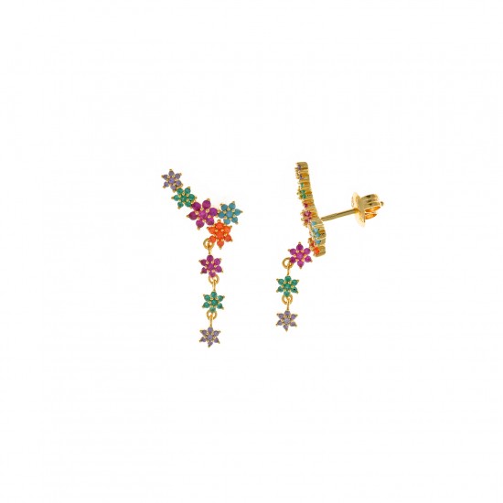 Pendientes fabricados en plata de ley con baño de oro formados por florecitas de varios colores. Tiene una parte que se coloca como un trepador y otra parte un poquito larga que cuelga. Cierre de presión. La zona que cuelga mide 2.5cm de largo.