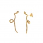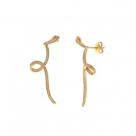 Pendientes fabricados en plata de ley pero con baño de oro en forma de serpiente llena de pequeñas circonitas blancas brillantes desde la cabeza a la cola. Cierre de presión. Miden 4.6cm de largo.
