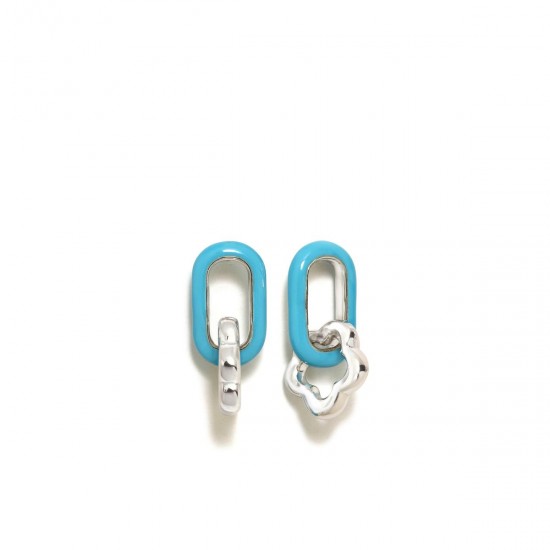 Pendientes fabricados en plata de ley con baño de rodio en forma de flor y esmalte azul. Cierre de presión