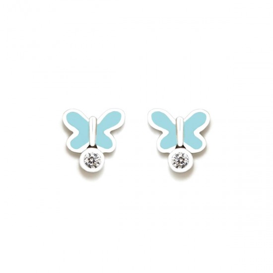 Pendientes fabricados en plata de ley con baño de rodio en forma de mariposa azul con una brillante circonita. Cierre de rosca