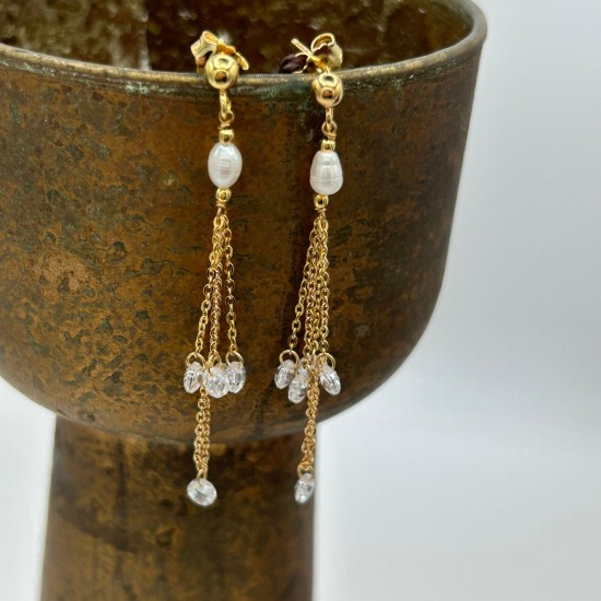 Pendientes largos fabricados en plata de ley con un perla de la que cuelgan 5 cadenas, dos de ella unidas por un brillante cristal. Miden 5.5cm de largo. Cierre de presión.