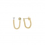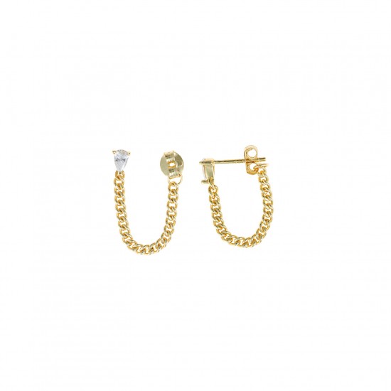 Pendientes fabricados en plata de ley con baño de oro en forma de cadena con una brillante circonita en forma de lágrima invertid. Ideales para combinar con tus looks de día a día. Cierre de presión. Miden 2.2cm de largo.