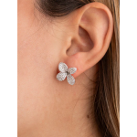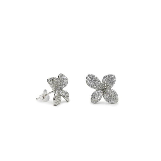 Pendientes pequeños en forma de flor fabricada en plata de ley formada por pequeñas y brillantes circonitas. Perfectos para añadir un toque sutil de glamour a tu estilo diario. Cierre de presión.