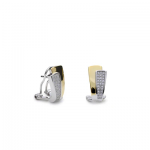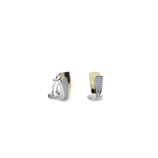 Pendientes bicolor fabricados en plata de ley, una parte con baño de oro y otra con circonitas engastadas. Un diseño moderno y sofisticado que aporta estilo, luminosidad y distinción a tu look. Cierre omega.