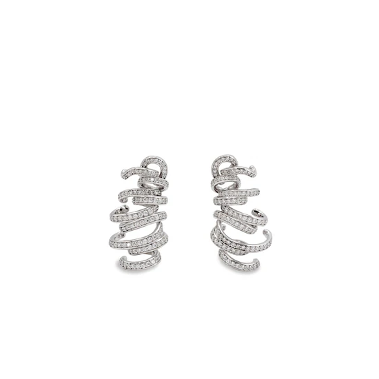 Pendientes fabricados en plata de ley con un diseño muy original enredado formados por pequeñas y brillantes circonitas que aportan luminosidad. Ideal para dar un toque de distinción a cualquier look. Miden 3cm de largo. Cierre de presión.