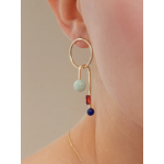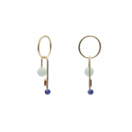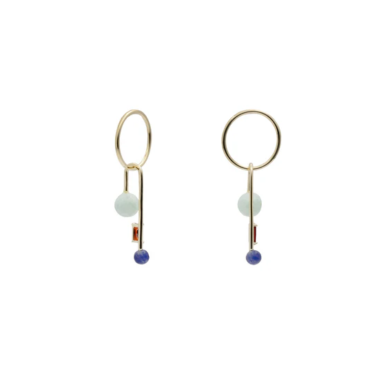 Pendientes largos fabricados en plata de ley con baño de oro que combinan una estructura de diseño geométrico y piedras naturales en tonos suaves y vibrantes. Destacan esferas de amazonita en azul celeste, piedras sodalita en azul intenso y toque de color con detalles granate. Mide 4.7cm de largo. Cierre de presión.