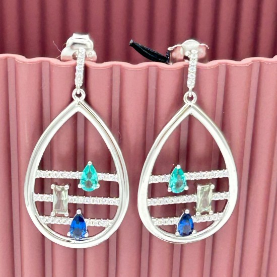 Pendientes largos fabricados en plata de ley con tres líneas horizontales de pequeñas y brillantes circonitas blancas y gemas en color azul y verde. Miden 3.5cm de largo. Cierre de presión. Perfectos para lucir en ocasiones especiales.