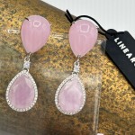 Pendientes largos fabricados en plata de ley formados por dos cuarzos rosas en forma de lágrima; uno sujeto por tres garras de plata y otro rodeado de un cerco de plata de brillantes circonitas. Ambos separados a su vez por una pequeña y brillante circonita blanca. Miden 3.7cm de largo. Cierre de presión. Perfectos para eventos especiales o incluso para una novia que busca algo diferente.