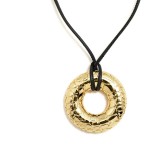 Colgante latón bañado y cuero. Acabado e-coating. Cierre mosquetón y cadena de extensión.