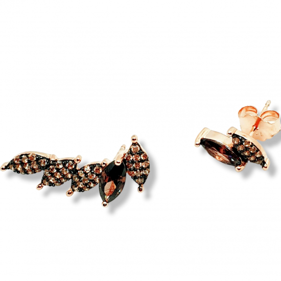 Pendientes de plata bañada en oro rosa y circonitas color marrón. Diseño desigual trepador.