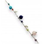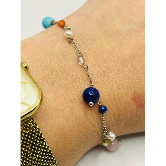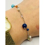 Pulsera en plata de ley y bolitas en lapizlázuli, perla, turquesa y cuarzo de color. 16+3cm de largo