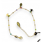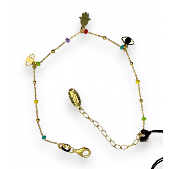 Pulsera en plata dorada con colgantes y bolitas esmaltadas de colores. 16+4 cm de largo