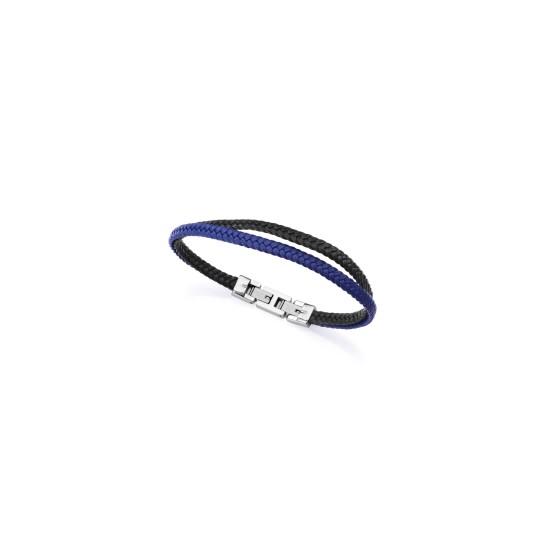Pulsera doble de hombre en acero, combinada con piel trenzada en negro y azul, que aporta un toque de estilo moderno y rústico. El contraste entre los tonos de la piel y la robustez del acero crea un diseño equilibrado y lleno de carácter. Perfecta para el hombre que busca un accesorio versátil y elegante, esta pulsera es ideal tanto para el día a día como para ocasiones especiales. Su diseño doble añade textura y dinamismo, convirtiéndola en una pieza imprescindible en cualquier colección masculina. Largo 19.5-21 cm.