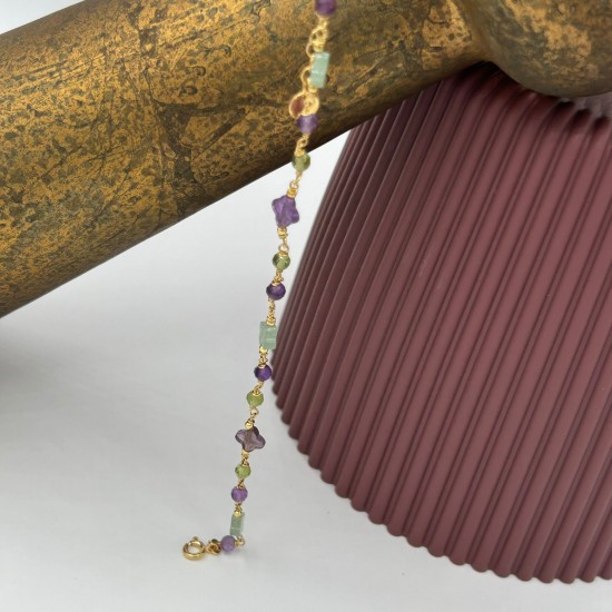 Pulsera fabricada en plata de ley con baño de oro y piedras naturales. Mide 17.5cm de larga más 3.5cm de extensión. Cierre de reasa.