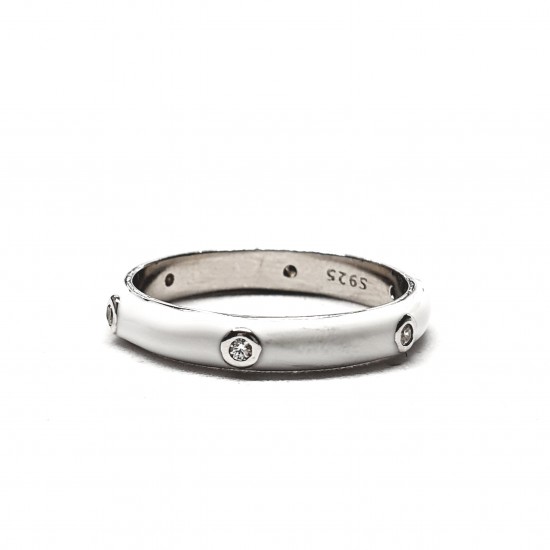 Sortija en plata de ley con detalles de circonitas y esmaltado en blanco. Talla disponible: 14