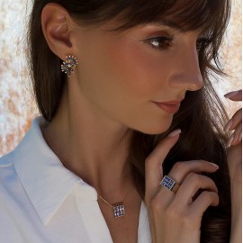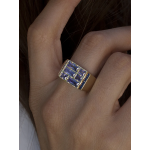 Anillo con piedras de plata bañada en oro con gemas talla esmeralda en tono amatista y zafiro. Ideal para lucir con los pendientes. La medida disponible en tienda es la