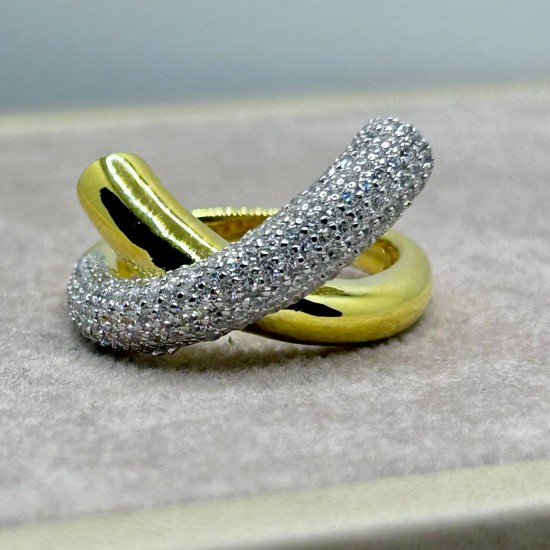 Sortija en plata de ley bañada en oro y circonitas, un diseño atemporal y elegante. La medida disponible en tienda es la