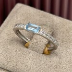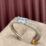 Sortija fabricada en oro blanco de 18k con una piedra aguamarina en el centro y 7 brillantes circonitas blancas en línea en los laterales. Disponible en talla 13. Consúltanos para más tallas y tiempos de entrega.