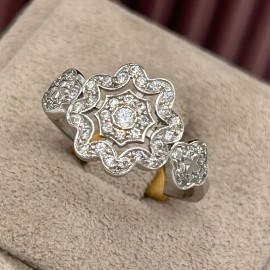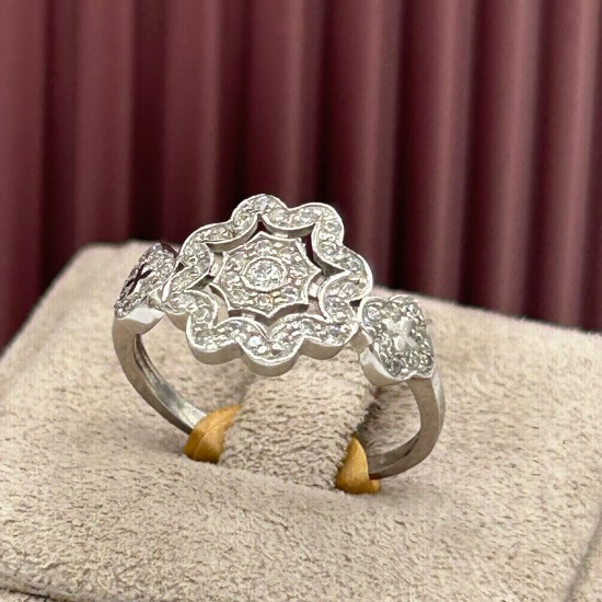 Sortija fabricada en oro blanco de 18k en forma de flor formada por brillantes circonitas. Disponible en talla 12. Consúltanos para mas tallas y tiempos de entrega.