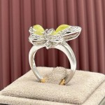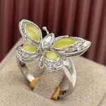Sortija fabricada en oro blanco de 18k en forma de mariposa con una circonita blanca ovalada en el centro, y cuatro piedras verdes en las alas. Disponible en talla 16. Consúltanos para más tallas y tiempos de entrega.