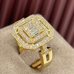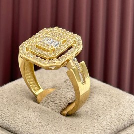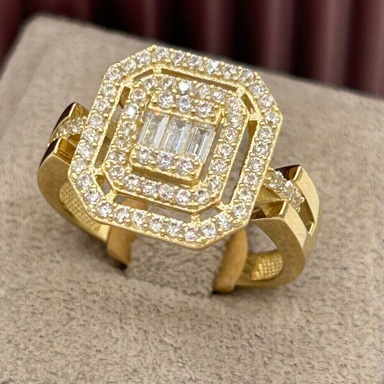 Espectacular sortija fabricada en oro de 18k formada por tres piedras baguette en el centro rodeadas por dos octógonos de pequeñas y brillantes circonitas blancas. Disponible en talla 15. Consúltanos para más tallas y tiempos de entrega.