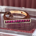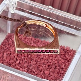 Sortija fabricada en plata de ley con baño de oro rosa y circonitas color rubí. Puede adaptarse a otras tallas gracias a su diseño multisize. Disponible en talla 16.