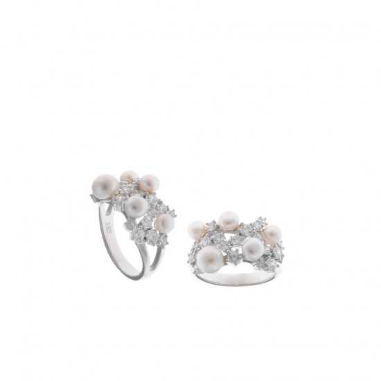 Sortija fabricada en plata de ley con perlas y circonitas. Disponible en talla 14. Consúltanos para más tallas y tiempos de entrega. Pertenece a la colección wedding de Salvatore plata.
