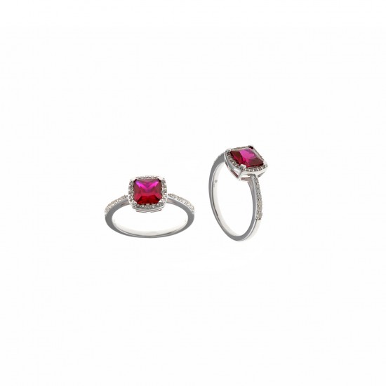 Sortija fabricada en plata de ley con baño de rodio formada por una piedra rubí cuadrada rodeada de brillantes circonitas blancas alrededor de la piedra y dos líneas de circonitas a ambos lados de la misma. Disponible en talla 14. Consúltanos para más tallas y tiempos de entrega.