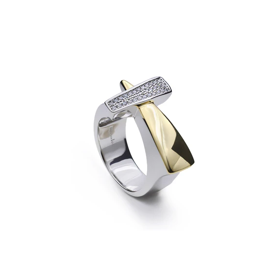 Sortija bicolor fabricada en plata de ley con diseño geométrico, un parte con baño de oro y otra con circonitas engastadas. Disponible en talla 16. Consúltanos para más tallas y tiempos de entrega. Perfecta para combinar con todos tus looks en cualquier ocasión.