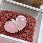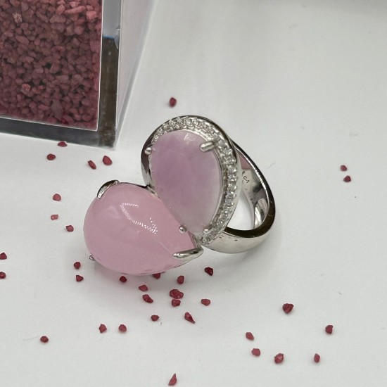 Sortija fabricada en plata de ley con dos cuarzos rosas en forma de lágrima. Una piedra sujeta por tres garras de plata y otra rodeada por un cerco de pequeñas y brillantes circonitas. Disponible en talla 15. Consúltanos para más tallas y tiempos de entrega. Perfecto para combinar con los pendientes largos en un evento especial o incluso para una novia.